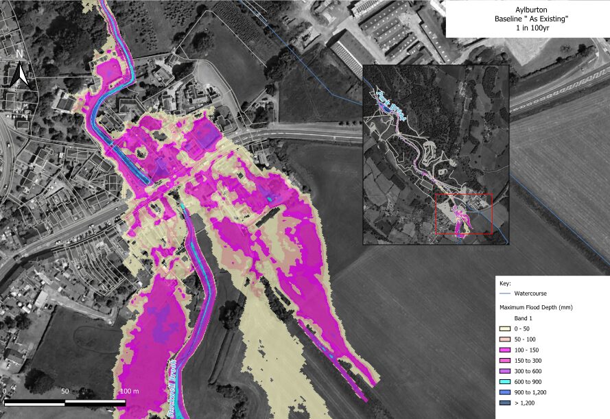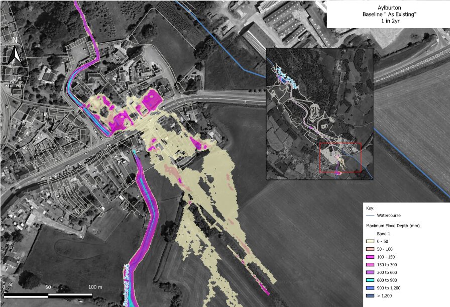 We have three model outputs. The first shows the results of a 1 in 2 year event, or an event that has a 50% chance of happening in any given year, the second is the results of a 1 in 30 year event (3.3% chance in any given year) and finally a 1 in 100 year event, or one that has a 1% chance of happening in any given year. The 1 in 2 year event is a much more frequently occurring event, while the 1 in 100 year event is a more extreme event. Please note, the model only shows the risk from the watercourse, it does not include surface water flooding.